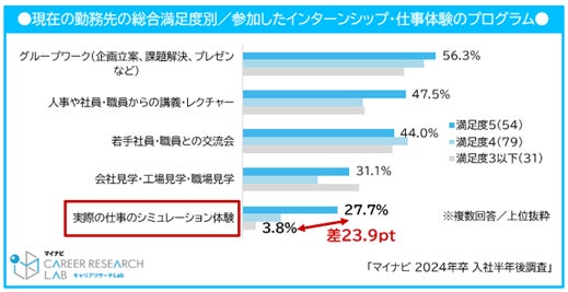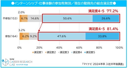 また入社前後で満足度が下降した割合は前年同値(40.1%)となったが、上昇した割合は18.6%(前年比9.8pt増)と、23年卒よりも入社後に満足度が上昇した人が多かった。一般的に入社直後はリアリティショック※2を感じやすいとされているが、24年卒は23年卒と比較してインターンシップ・仕事体験などの参加率も増加し、入社前の企業理解の機会の充実によって、リアリティショックが入社前に起こるケースもある。それにより就活時の満足度は低下するが、入社後のギャップが縮小すると推察される。【図3、4】