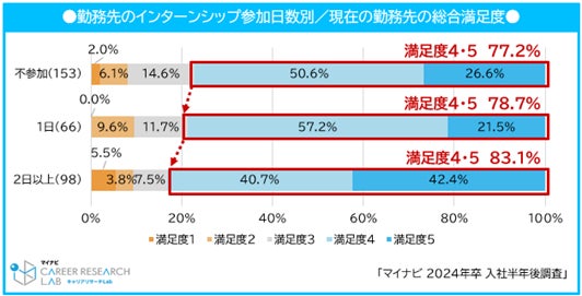 現在の勤務先のインターンシップ・仕事体験に参加した割合は49.3%となり、調査を開始した20年卒以来、おおよそ右肩上がりで増加している。インターンシップ・仕事体験の参加有無別に総合満足度を見ると、参加経験者の81.4%が勤務先の満足度が4もしくは5だったのに対し、不参加者は77.2%と、4.2ptの差があった。さらにインターンシップ・仕事体験の参加日数に注目すると、1日よりも2日以上の参加者の方が満足度4もしくは5を選択した割合が多い。