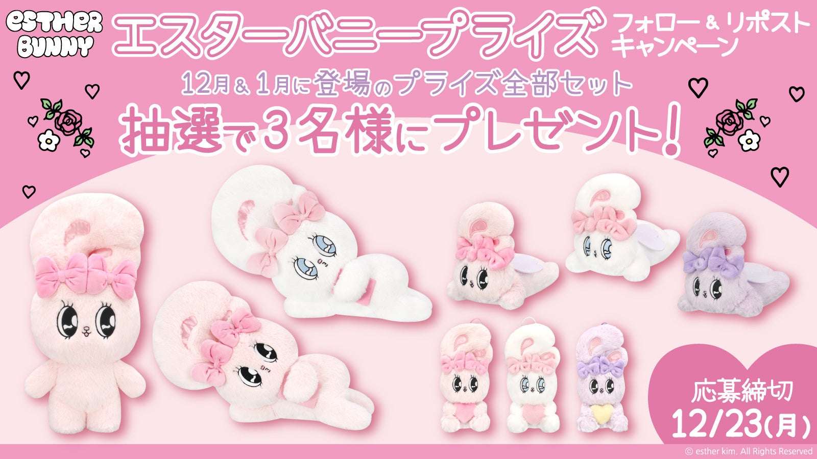 また、フリュープライズ公式Xアカウント(@FURYU_prize)をフォローし 対象投稿をリポストすると「エスターバニー」のプライズセットが3名様に当たるキャンペーンも実施いたします。人気の「エスターバニー」の豪華アイテムがもらえるこの機会をぜひお見逃しなく。