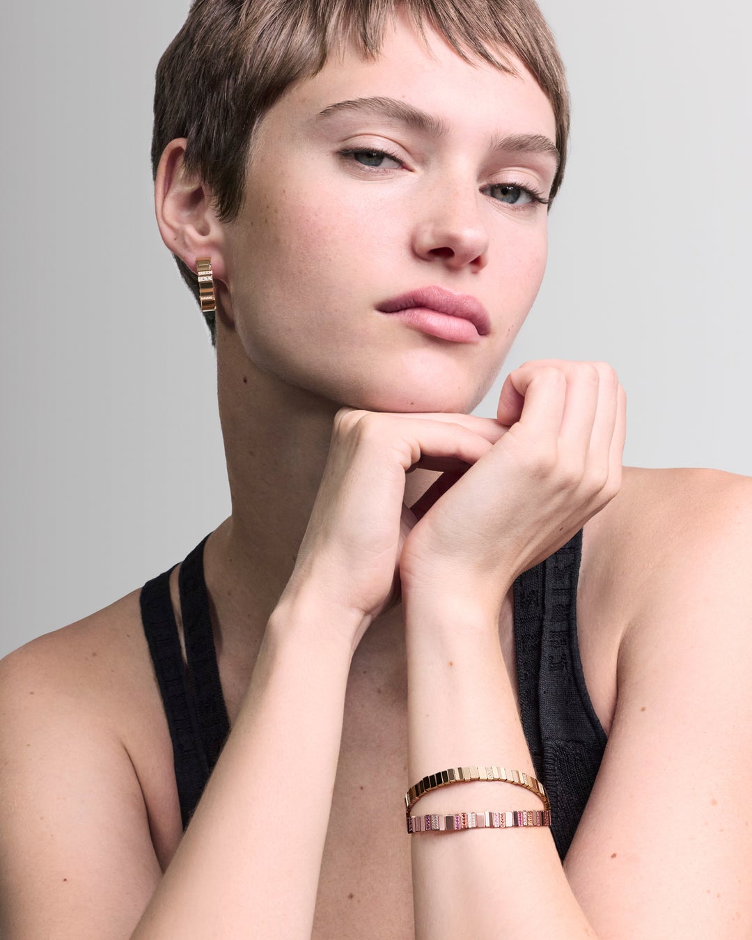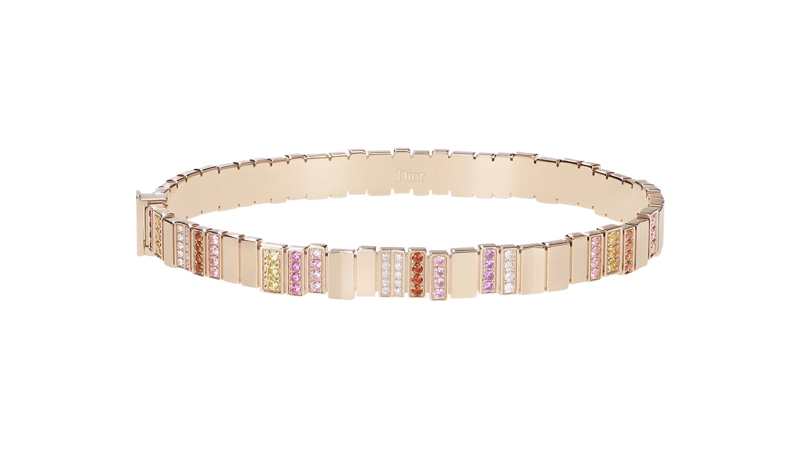 2025年、幾何学的なモチーフがグラフィカルに配されたデザインがシンボリックな「ジェム ディオール」コレクションより新作ジュエリーが登場します。イエロー、ピンク、および、ホワイトゴールド製の新作イヤリングとヴィクトワール・ドゥ・カステラーヌが色彩に注ぐ情熱へのオマージュとして、サファイアとスペサルタイトガーネットの魅惑的なグラデーションによりデザインされたブレスレットの計4モデルが加わり、より豊かな取りそろえによりさらに充実いたします。