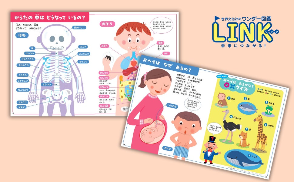 「世界文化社のワンダー図鑑LINK(リンク)」は、今を生きる子どもたちに必要な学びがつまった新しい図鑑シリーズ。LINK での学びが、未来へのアクションにつながります。 第一弾の『なぜなにからだ図鑑』は、身近な疑問からからだのしくみを知り、自分を大切にすることを学べる本です。