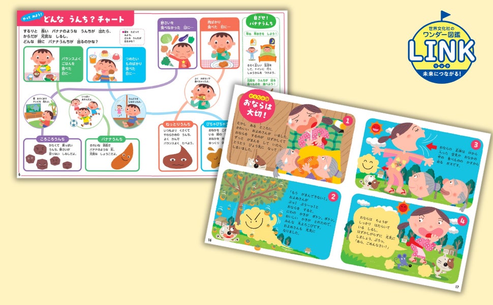 ◆ 「どんなうんち?」チャートや「おならは大切」小話など、楽しく学べる工夫がいっぱい!