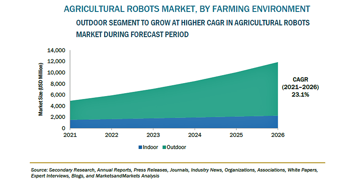 農業ロボットの市場規模は、2021年の49億米ドルからCAGR19.3%で成長し、2026年には119億米ドルに達すると予測されています。農業ロボットは、時間のかかる、繰り返しの多い、退屈な作業を自動化し、農家が生産量全体の向上に集中できるようにします。農業ロボットには、無人航空機(UAV)やドローン、搾乳ロボット、自動収穫システム、無人トラクターなどのほか、苗床や温室で使用される無人地上車(UGV)ロボット、仕分け・梱包ロボット、雑草管理ロボットなどがあります。現在、農業ロボット市場では、搾乳ロボットとドローンが主流となっています。しかし、実用化が進んでいることから、今後3~4年のうちに、無人トラクター市場がドローンや搾乳ロボットを追い越すと予想されます。人口増加と労働力不足の深刻化、IoTやナビゲーション技術の成熟、COVID-19パンデミックなどが、農業分野でのロボット利用を加速させる要因となっています。これに加えて、農業における自動化のための未開発の市場の可能性と範囲、農業ロボットにおける電化技術の使用の増加、リアルタイムのマルチモーダルロボットシステムのフィールドでの使用は、無人トラクター、搾乳システム、ドローンのメーカーにいくつかの市場機会をもたらしました。