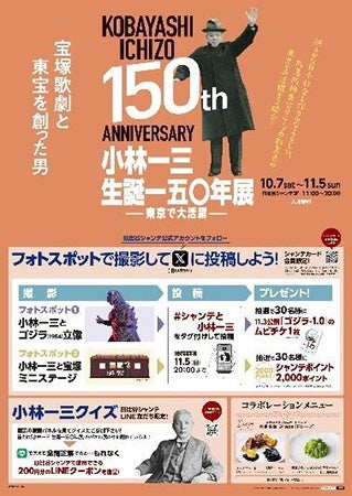 催事会場のフォトスポット「ゴジラ(1954)」「宝塚ミニステージ」で写真を撮影し、「#シャンテと小林一三」をタグ付けしてX(旧Twitter)に投稿してください。