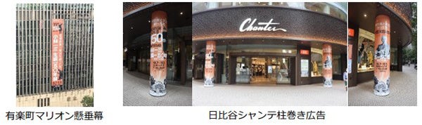 本催事の屋外広告が日比谷各所に登場しています。9月22日(金)から、阪急メンズ東京が入居する有楽町マリオンに懸垂幕が掲げられ、小林一三とゴジラが鉄道や日比谷の街を見守っています。また、9月26日(火)からは、日比谷シャンテ入口の柱巻き広告に小林一三が現れ、皆様のご来場をお出迎えしています。