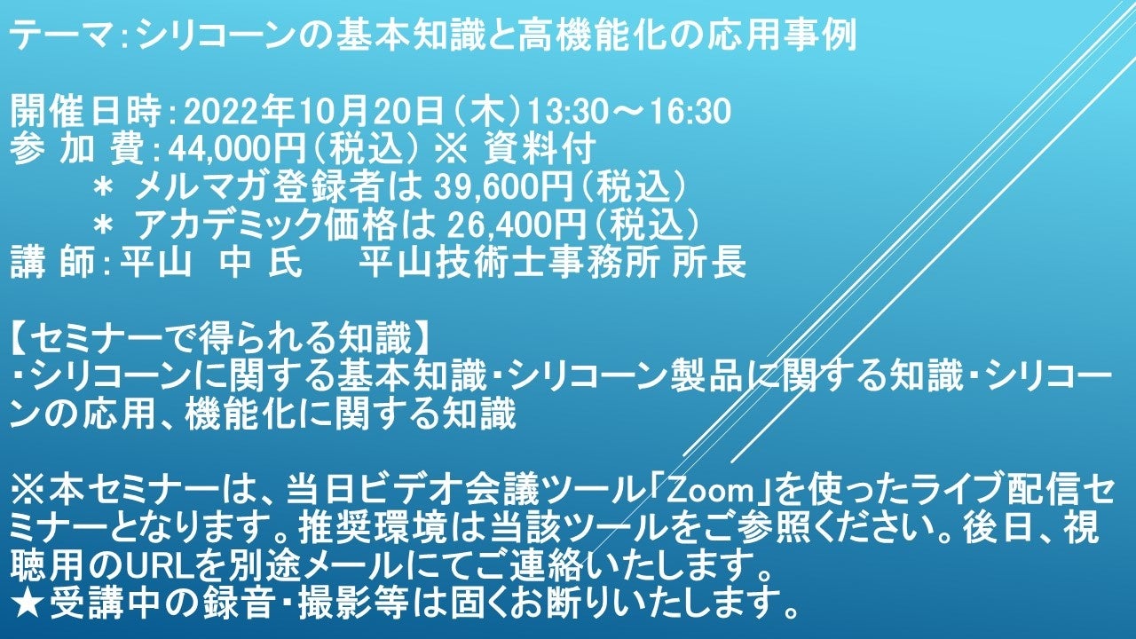 先端技術情報や市場情報を提供している(株)シーエムシー・リサーチ(千代田区神田錦町: https://cmcre.com/ )では、 各種材料・化学品などの市場動向・技術動向のセミナーや書籍発行を行っておりますが、 このたび「シリコーンの基本知識と高機能化の応用事例」と題するセミナーを、 講師に平山 中 氏 平山技術士事務所 所長)をお迎えし、2022年10月20日(木)13:30より、 ZOOMを利用したライブ配信で開催いたします。 受講料は、 一般:44,000円(税込)、 弊社メルマガ会員:39,600円(税込)、 アカデミック価格は25,000円(税込)となっております(資料付)。