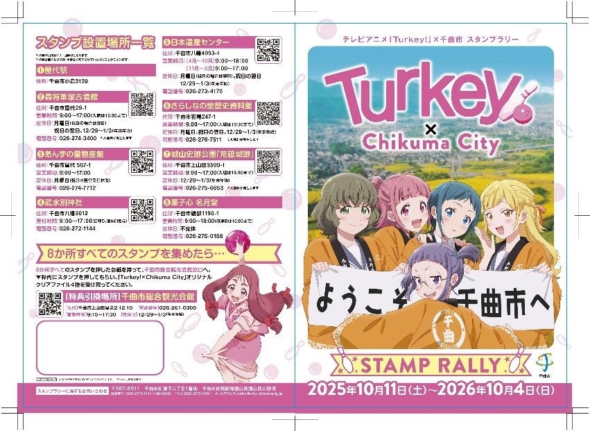 日本テレビ、BS日テレ、テレビ信州にて 2025年7月から9月まで放送されたオリジナルテレビアニメ「Turkey!」。物語の舞台となった長野県千曲市で2025年10月11日(土)よりスタンプラリーを開催します!市内8か所を巡り、オリジナルクリアファイルをぜひゲットしてください!