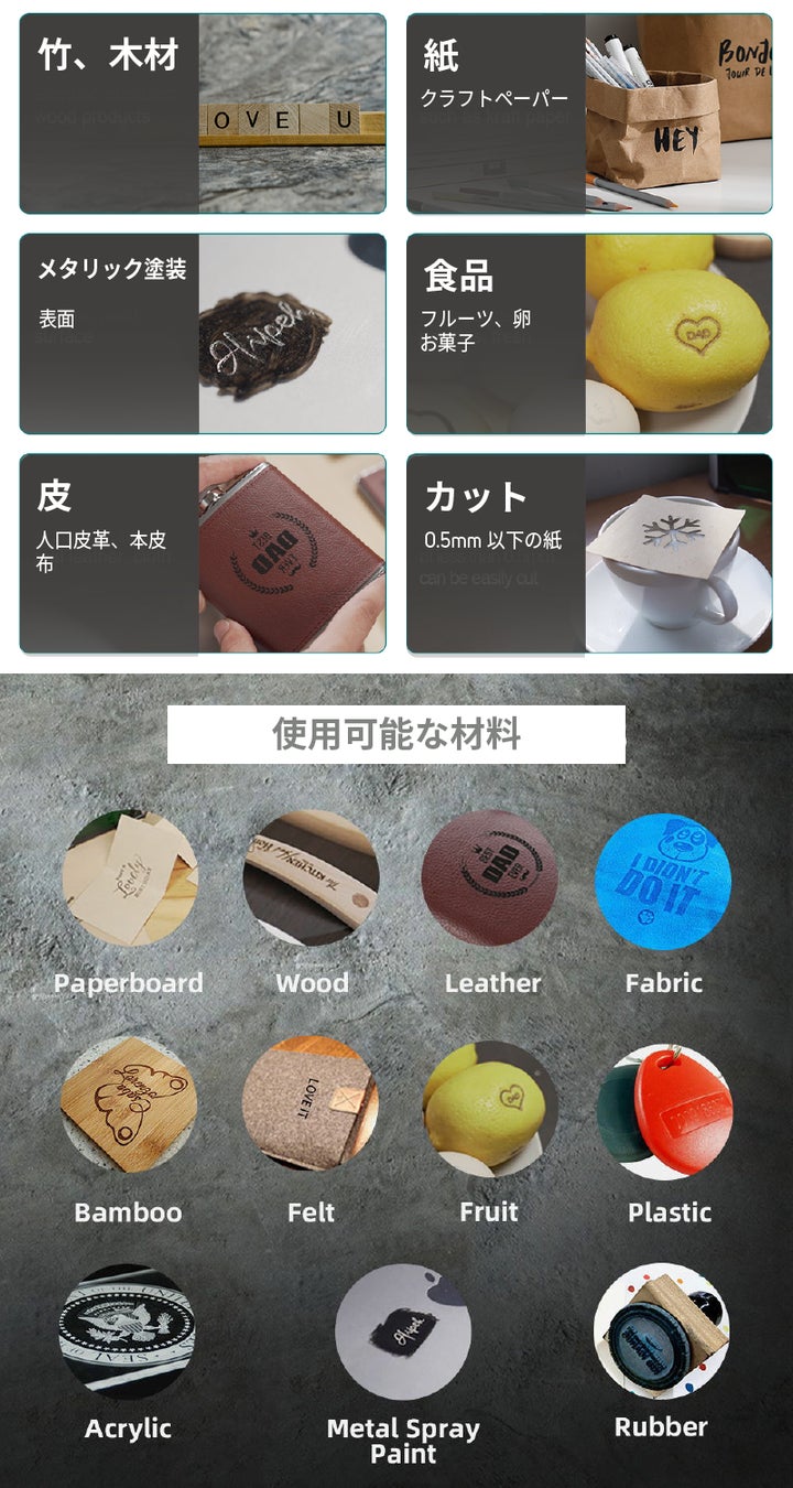 木材、紙、竹など自然の素材からレザーなどの革やメタリック塗装などのDIYでお馴染みの素材まで、多くのものに対応しています。