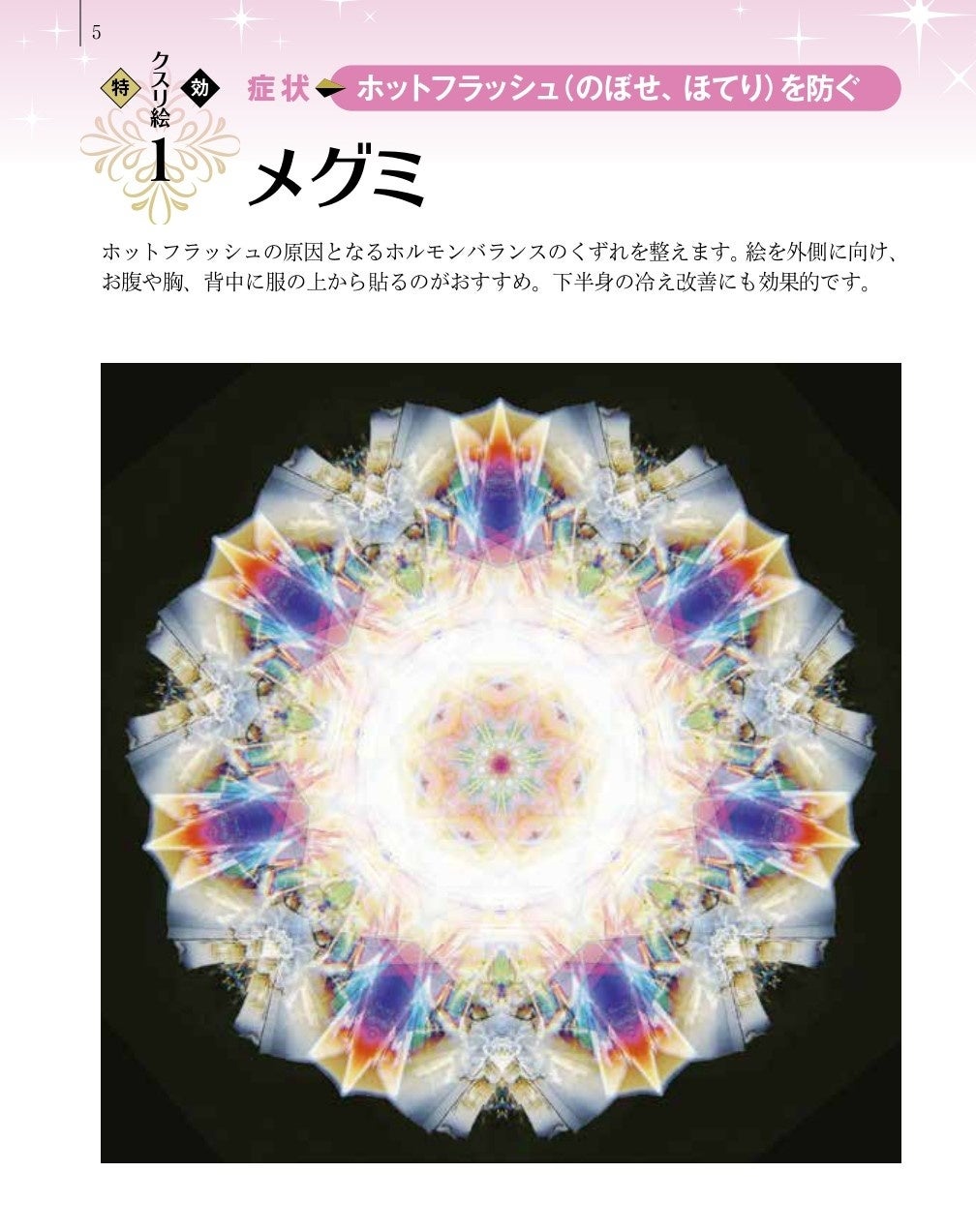 本書では更年期以降の女性の悩みに焦点を当て、痛みや不調に効くクスリ絵を厳選しました。付録のクスリ絵シールは、痛みや不調を取り去るパワーが強い図柄を選出、体に直接または肌着の上から貼って使えるようにしたものです。