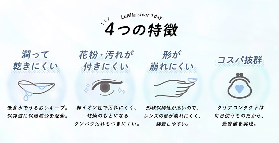 “私らしく、輝く”がコンセプトで、快適な着け心地に定評のある『LuMia』シリーズから、使用者の毎日に自然に溶けこむクリアコンタクトレンズ『LuMia clear 1day』が登場します。オンの日もオフの日も着け心地にこだわった『LuMia』を使い分けることで、自分らしい生活スタイルに一体感を持たせることができます。