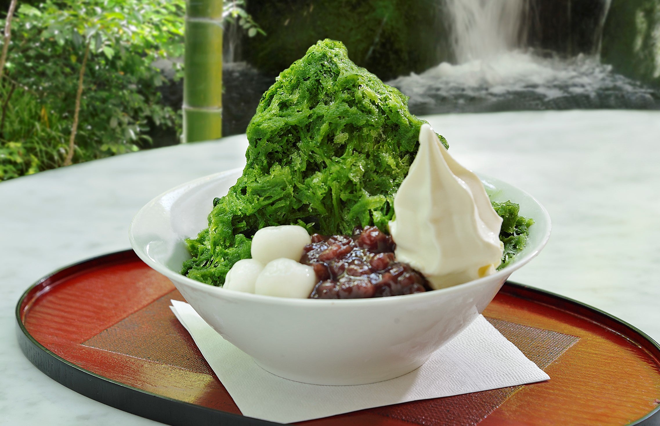 「メインラウンジ」では、京都の老舗「新伝兵衛(あたらしでんべえ)」のオリジナル宇治抹茶で作る、濃厚で香り高い自家製シロップを使用した「宇治金時」をご用意。大きな窓から日本庭園を眺めながら、和の涼をゆったりとお楽しみいただけます。