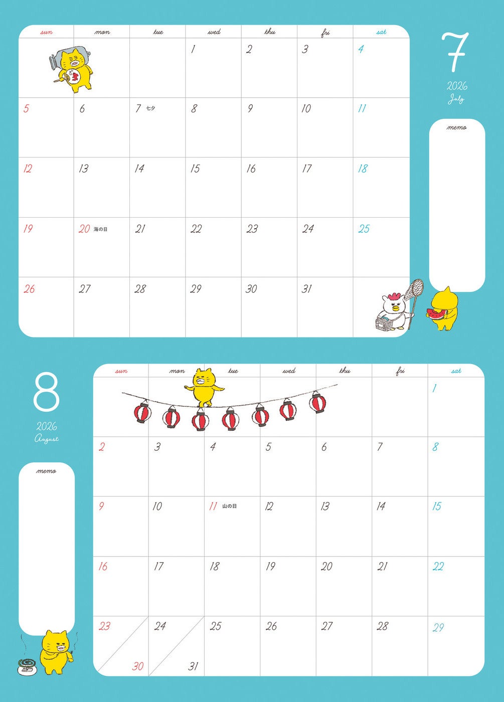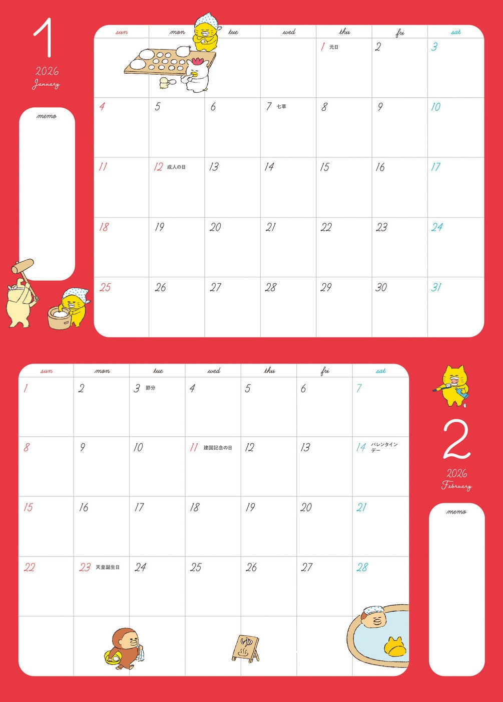 毎年大好評の B5 サイズ・全16ページの壁掛けカレンダー。今年もたっぷり書き込めるスケジュール欄がうれしいポイント♪ 今回は、各月ごとに季節の風物を楽しむノラネコたちが登場。遊んだり、お手伝いしたりするノラネコの姿になんだか元気がもらえそう。2026 年も、ノラネコぐんだんと一緒に楽しい一年を過ごしましょう!