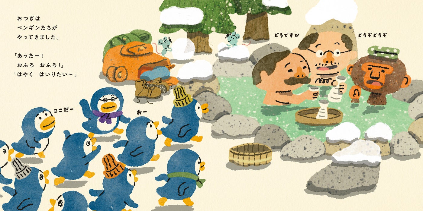 ここは雪の降るお風呂屋さん。お湯につかっていると、次々と思いがけないお客さんがやってきます! ペンギンたちに、ハリネズミ……今日はなんだか大賑わい。「次は誰がやってくるんだろう?」と思わずワクワクしてしまいます。中川貴雄さんのぬくもりあふれる絵にもほっこり。予想外の展開に夢中になりながら、ページをめくる手が止まらなくなるはず。