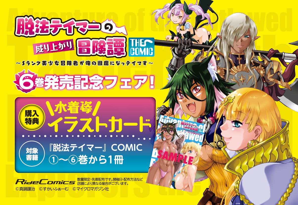 マイクロマガジン社(東京都中央区)は、2月27日に発売する月刊Webコミック誌『コミックライドアドバンス』で連載中のライドコミックス『脱法テイマーの成り上がり冒険譚~Sランク美少女冒険者が俺の獣魔になっテイマす~ THE COMIC 6』の発売を記念して、6巻発売記念フェアを開催いたします。対象コミック1巻~6巻の中から1冊ご購入いただいた方に、「水着姿イラストカード」を1枚プレゼントいたします。