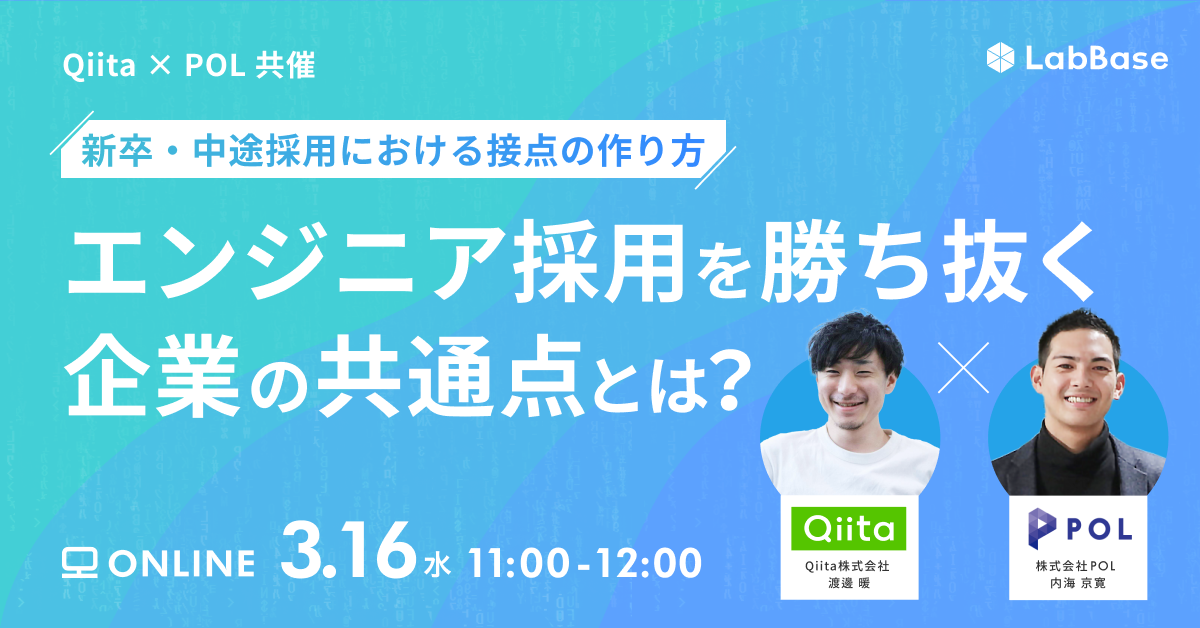 そこで今回、エンジニアに関する知識を記録・共有するためのサービス「Qiita」を運営するQiita株式会社と、理系の学生にアプローチできる新卒採用スカウトサービス「LabBase」を運営する株式会社POLがセミナーを共同開催。エンジニア採用における「接点の作り方」をテーマに、実際にエンジニア採用を成功させている企業が、どのような取り組みを行っているのかなど、新卒・中途採用の両方の視点から具体的な事例を交えてご紹介します。