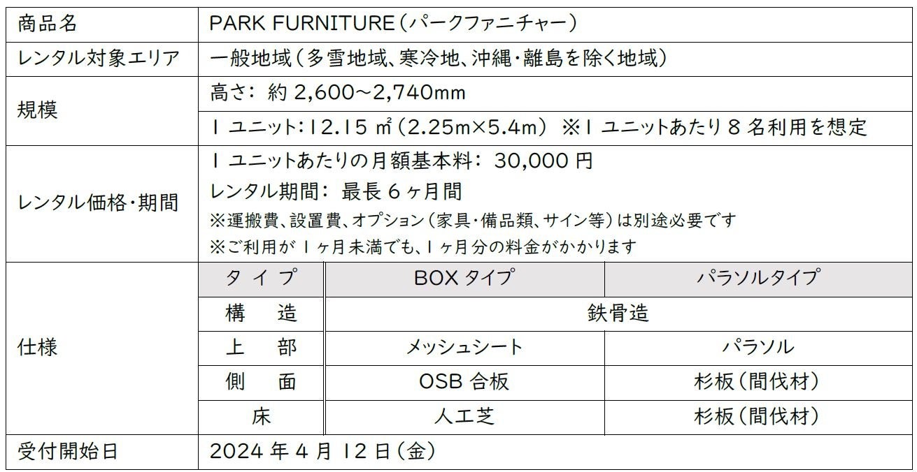 当社は全国で31ヶ所の公園事業実績(2024年4月11日現在の稼働済実績)があり、当社が管理を行う公園を訪れるお客様へのくつろぎ空間の提供を目的に本商品を開発、他の公園や屋外イベントでも活用いただけるようレンタル商品として展開します。