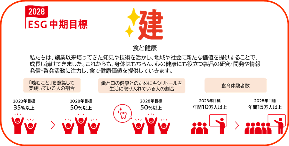 弊社は、「噛むこと」の健康に対する効用を長年研究し、啓発活動にも努めてまいりました。また、キシリトールを用いた幼児期のむし歯予防などの取り組みに努めてまいりました。近年では、ESGの中期目標として、「噛むこと」を意識して実践している方の割合、および、歯と口の健康維持、むし歯予防のために、「キシリトール」を生活に取り入れている人の割合を、2028年までに50%にすることを掲げております。