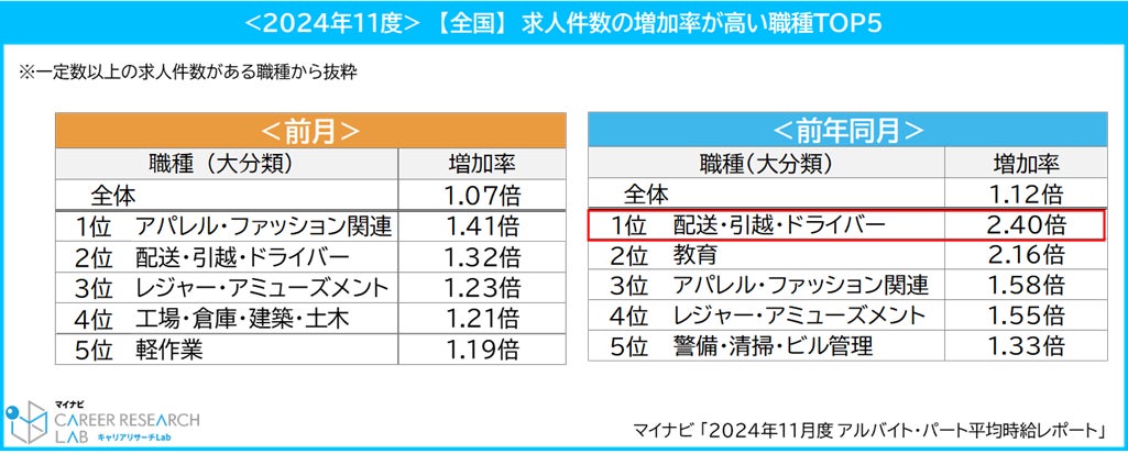 職種(大分類)別では、[配送・引越・ドライバー]は1,465円(前月比85円増、前年同月比315円増)で調査開始以来初めて1,400円台となった。求人件数も前年同月比2.40倍と積極的な採用が続いている。