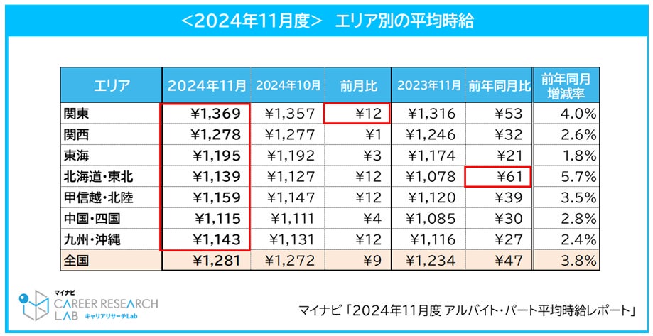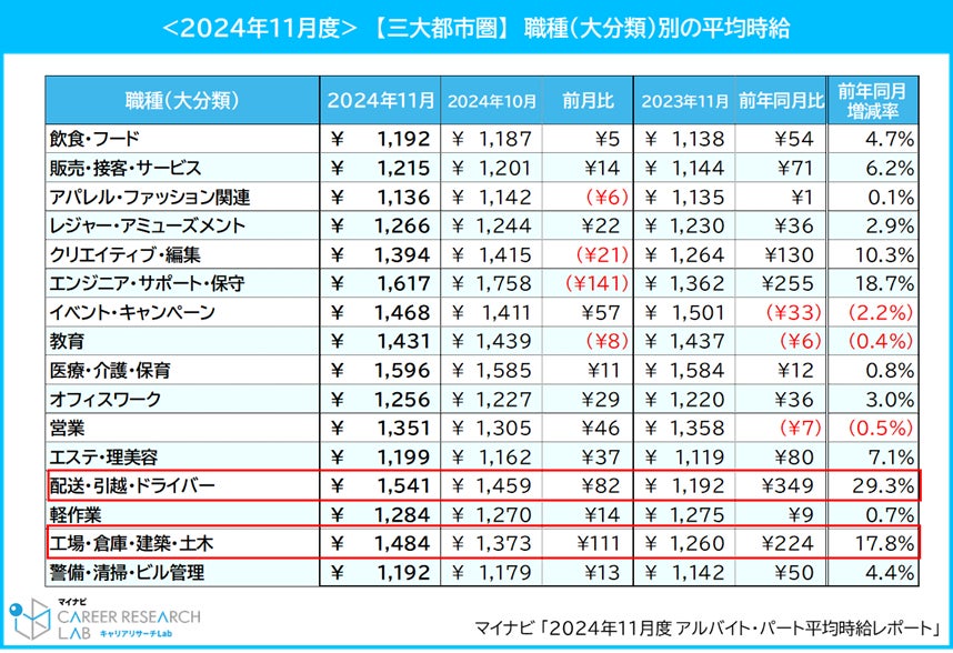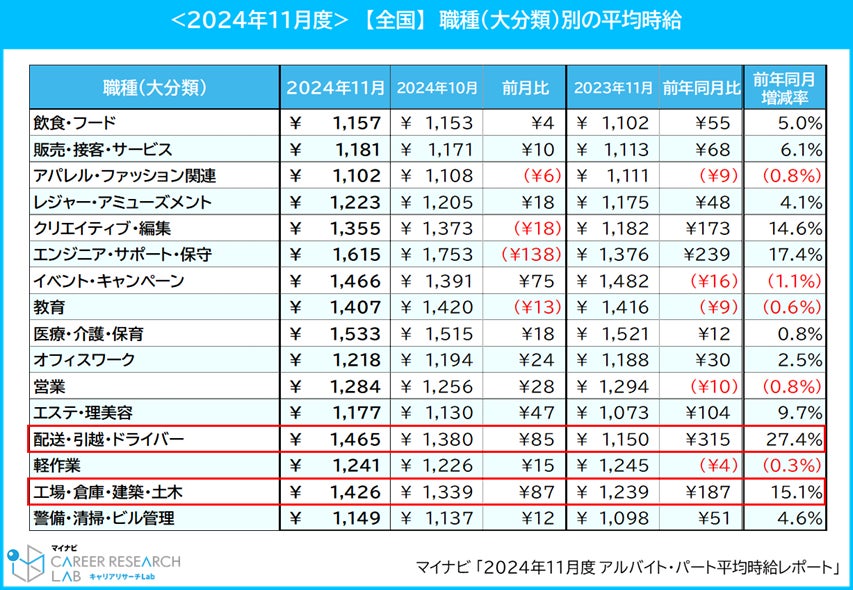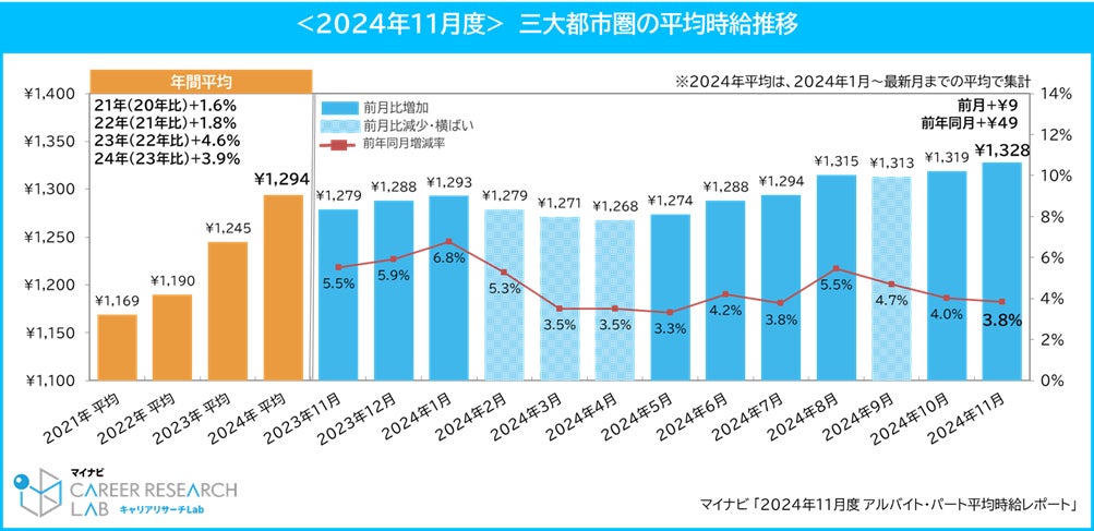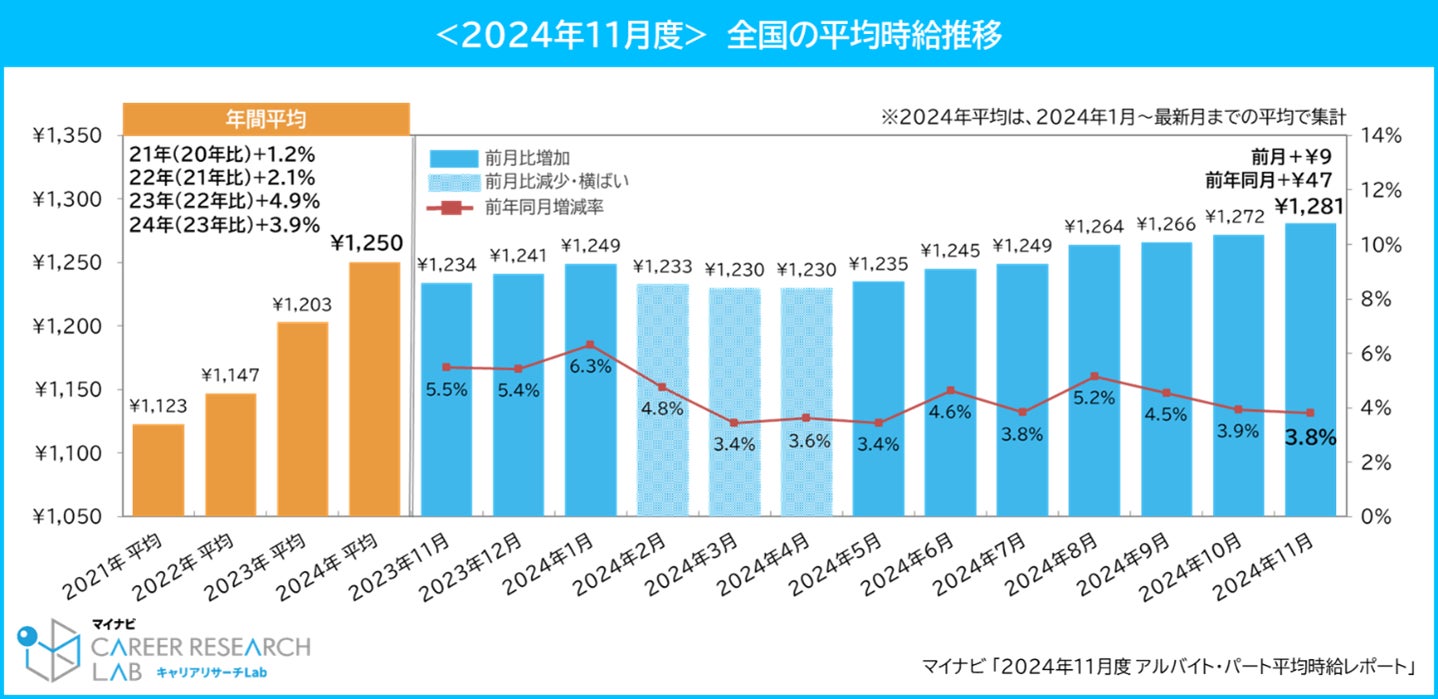 マイナビ、「2024年11月度アルバイト・パート平均時給レポート」を発表