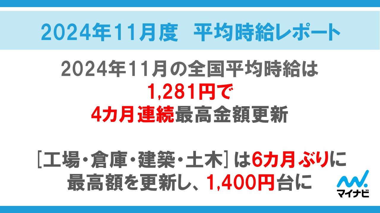 2024年11月の全国平均時給は1,281円(前月比9円増、前年同月比47円増)と4カ月連続で調査開始以来の最高額を更新した。