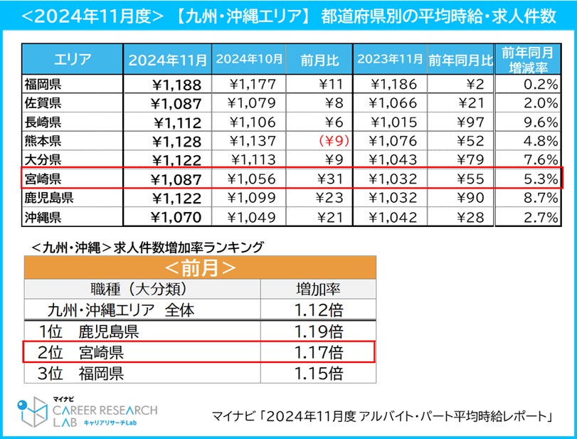 宮崎県の平均時給は1,087円で、九州・沖縄エリア内で前月比が最も増加