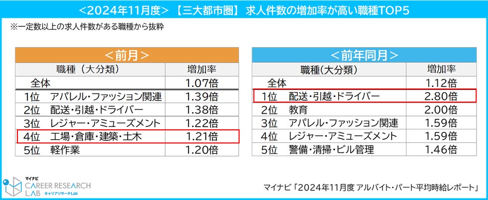 全国、首都圏ともに[配達・引越・ドライバー][工場・倉庫・建築・土木]で時給上昇や求人件数の増加が目立ちました。年末の贈り物やネット通販のセール開催など配送や倉庫管理の需要が上昇し、時給上昇を後押ししたのではないでしょうか。