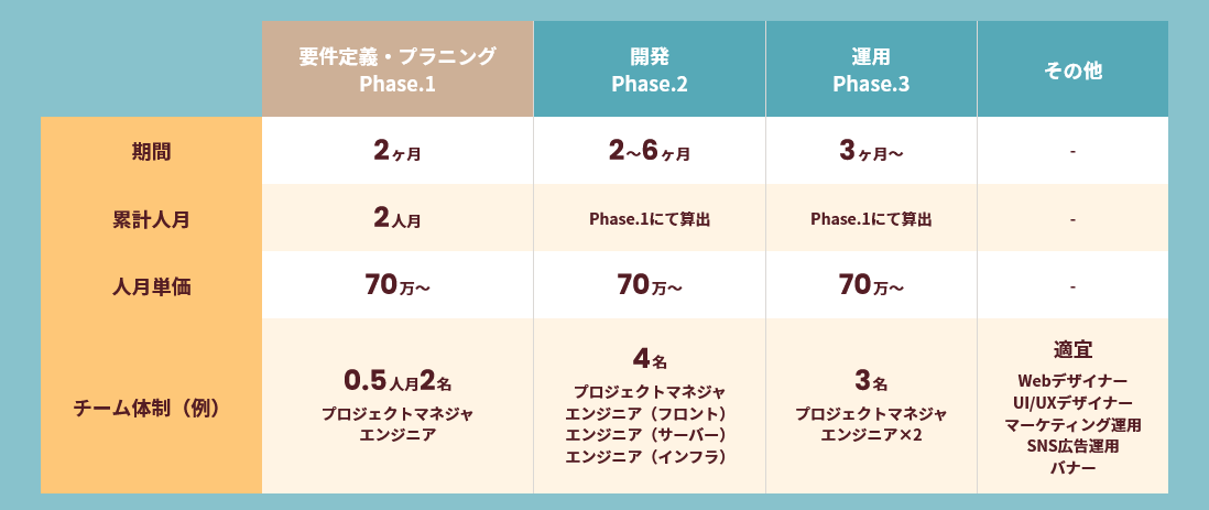 要件定義(Phase.1)から開発(Phase.2)、運用(Phase.3)の稼働に合わせて必要なエンジニア数や工数を調整可能です。