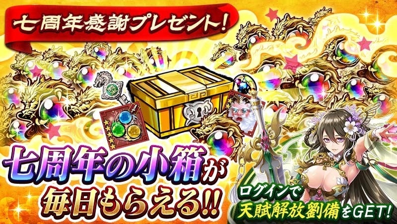 サービス開始7周年を記念して「七周年感謝祭」を開催!毎日無料10連ガチャや天賦解放「【四川の王】劉備」プレゼントなど、周年期間だけの豪華キャンペーンを開催します。