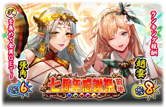 - 周年ポイントを集めると限定武将★5「趙雲」、★5「張角」がもらえる!