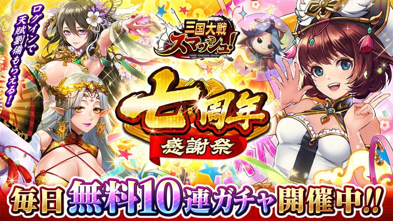株式会社エイチームのグループ会社である株式会社エイチームエンターテインメント(本社:愛知県名古屋市、代表取締役社長:中内之公)は、スマートフォン向けに配信する爽快ひっぱりアクションゲーム『三国大戦スマッシュ!』(さんすま)にて、サービス開始7周年を記念したキャンペーン「七周年感謝祭」を開催します。