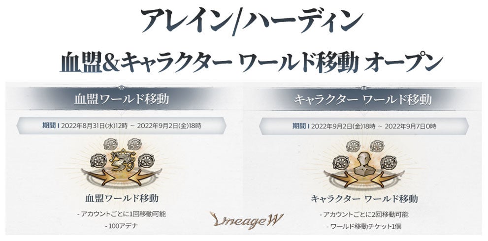 本日8月31日(水)12時から9月2日(金)18時まで「アレイン」、「ハーディン」間で行える「血盟ワールド移動」を、9月2日(金)18時から9月7日(水)0時まで「キャラクター ワールド移動」を開始します。