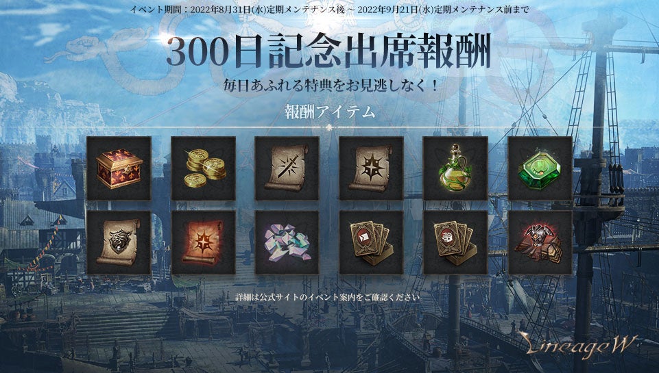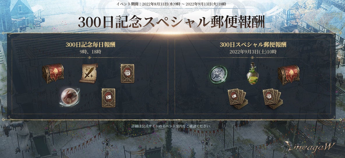 「リネージュW」のサービス開始300日を記念して、様々な恩恵を得られるイベントが開催されます。