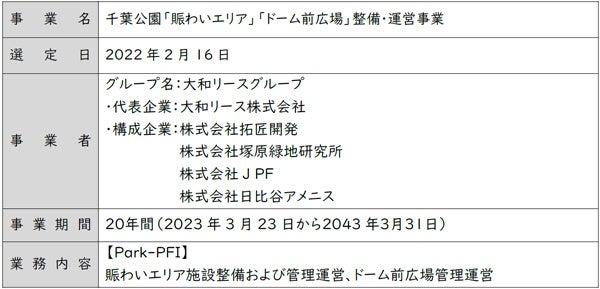 2021年9月に千葉市より公募された千葉公園「賑わいエリア」「ドーム前広場」整備・運営事業にて当社を代表とする企業グループが選定されました。