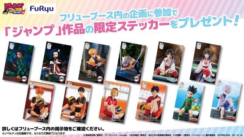 さらに、フリューが手掛けたぬーストのオリジナルステッカーを会場限定で配布します。人気TVアニメの4作品、『鬼滅の刃』、『逃げ上手の若君』、「ハイキュー!!」、『HUNTER×HUNTER』の計12キャラクターよりランダムで1種類を獲得することができます。