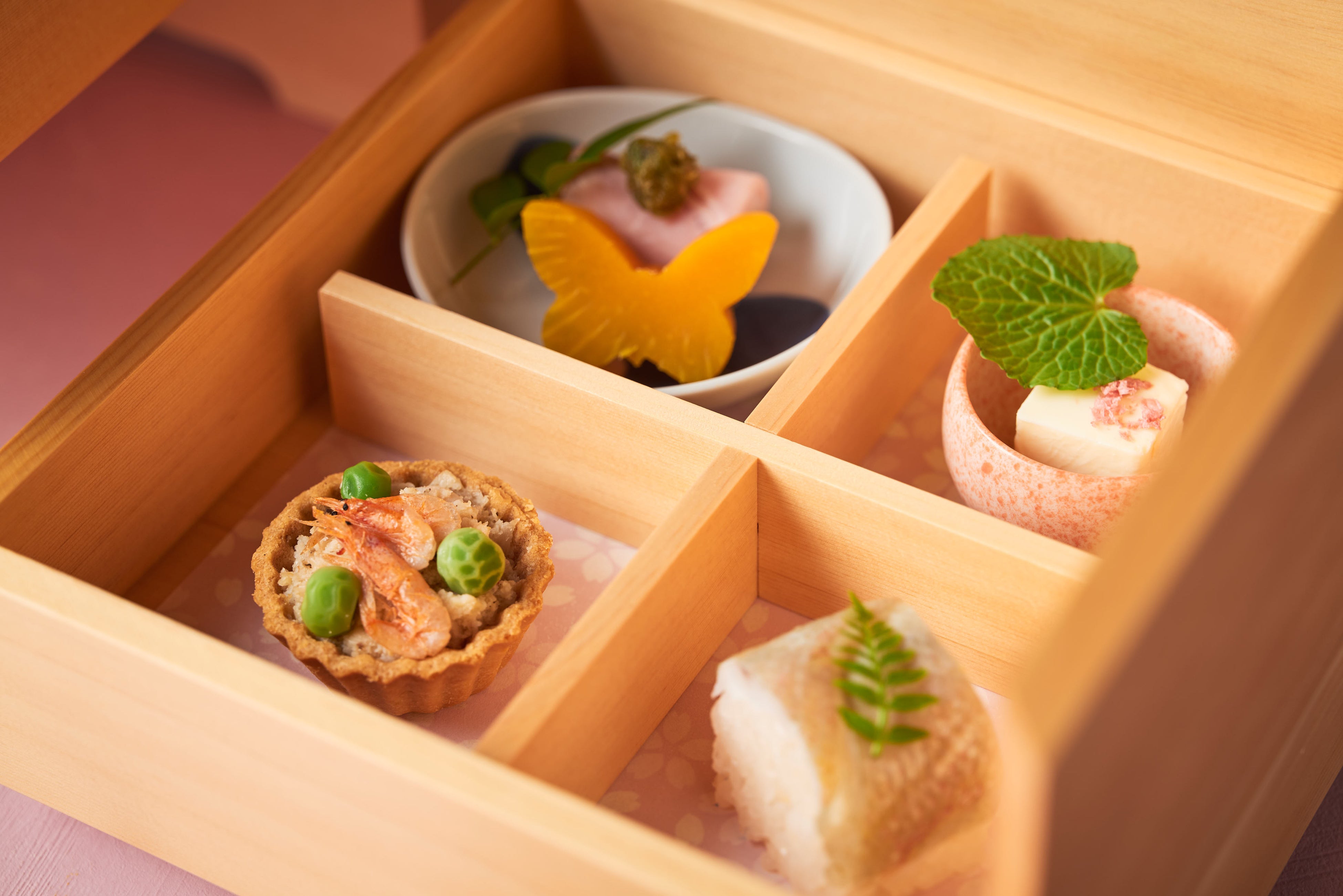 3階喫水線では、春の彩りと旬の味覚を詰め込んだ「桜ランチ弁当」をご提供いたします。ほのかに桜の香りが漂う「桜胡麻豆富の湯葉包み揚げ」ほか、瑞々しい芹や筍などの春野菜、桜鯛や桜海老の滋味深い素材の味わいが、春の訪れを感じさせる一折です。3色の花見団子も添え、春を存分に感じられる特別なお弁当です。