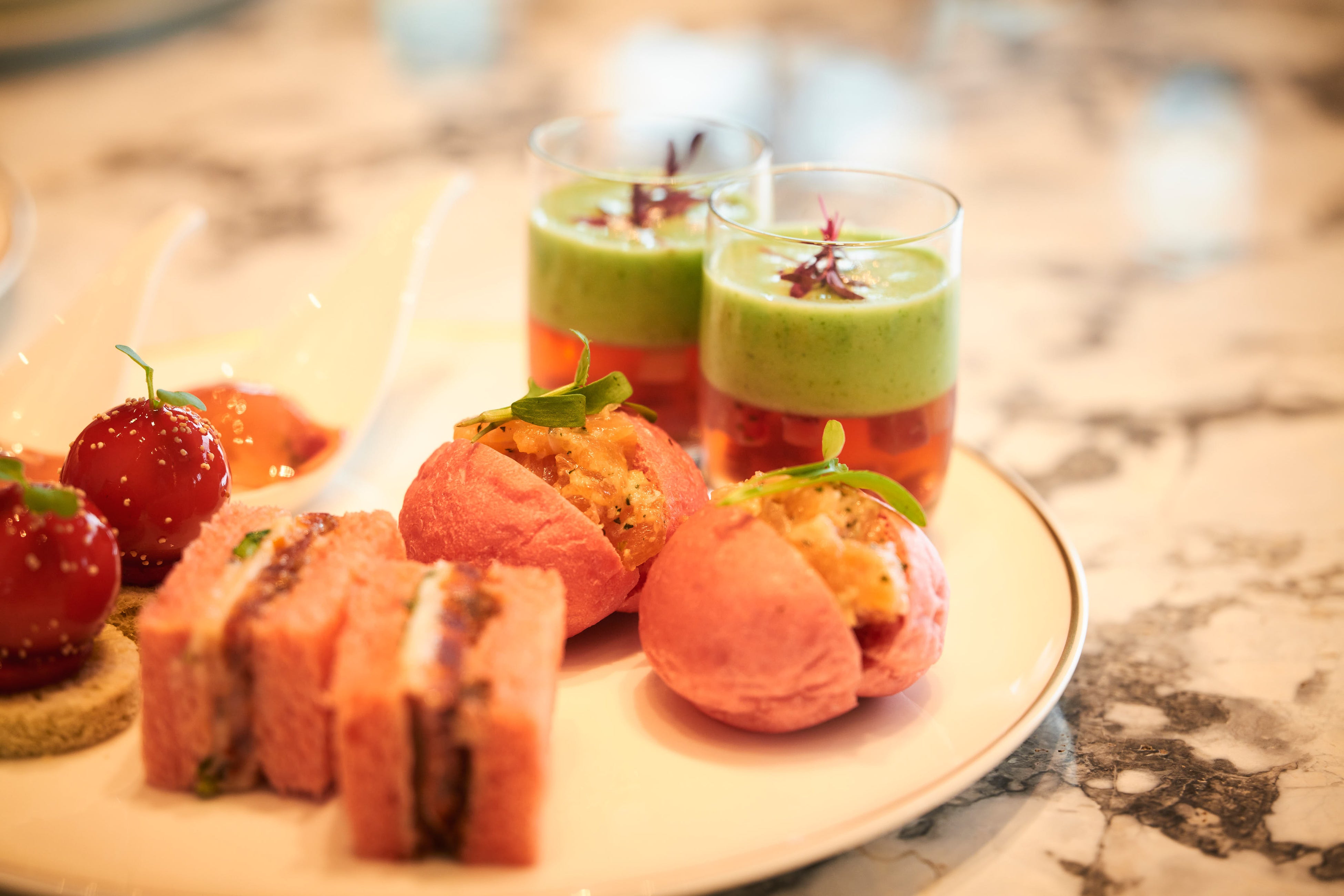 セイボリーには、春子鯛の旨味が引き立つ「桜昆布寿司」、桜海老と卯の花を使った「和のタルト」、西京味噌に漬け込んだクリームチーズなど、喫水線の料理長 天田内が趣向を凝らしたアイテムをお楽しみいただけます。抹茶やグリーンピースの春らしい色彩とともに、心ほどける春のティータイムをお楽しみください。
