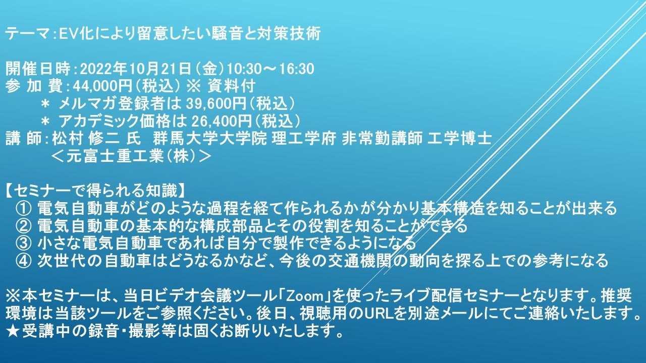 先端技術情報や市場情報を提供している(株)シーエムシー・リサーチ(千代田区神田錦町: https://cmcre.com/ )では、 各種材料・化学品などの市場動向・技術動向のセミナーや書籍発行を行っておりますが、 このたび「EV化により留意したい騒音と対策技術」と題するセミナーを、 講師に松村 修二 氏 群馬大学大学院 理工学府 非常勤講師 工学博士 <元富士重工業(株)>)をお迎えし、2022年10月21日(金)13:30より、 ZOOMを利用したライブ配信で開催いたします。 受講料は、 一般:44,000円(税込)、 弊社メルマガ会員:39,600円(税込)、 アカデミック価格は26,400円(税込)となっております(資料付)。