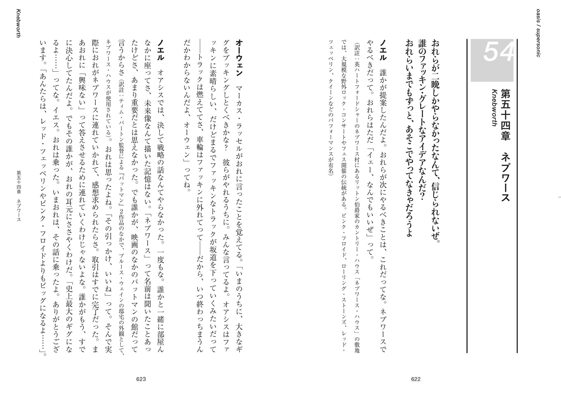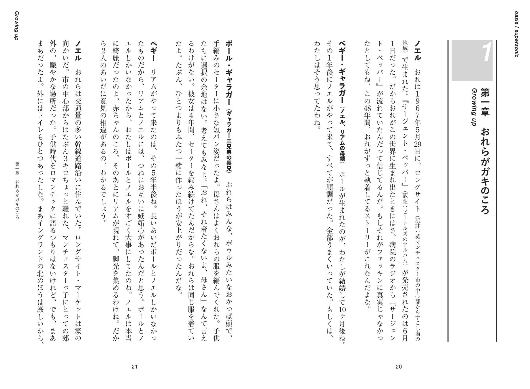 ノエル おれはリアムを愛してないし、嫌いでもない。おれらはただの家族で、家族ってのは、それぞれ違うもんだ――家族ってのは、気のきいた一言でまとめられるものじゃない。母さんは自分にとってどんな意味があるか? それは○○○○○に複雑すぎる質問だ。父さんは自分にとってどんな意味があるか? インタヴューで答えられるようなもんじゃない。愛してるって言うのは簡単さ。でもおれは、なにが愛だか知ってる。おれは妻を愛してる。それが愛だとしたら、おれはたしかにリアムを愛してない。おれが言ってること、わかるかな? 同時におれは、奴を嫌いでもない。そのちょうど真ん中のあたりに小さな場所があって……おれは奴らのクソを許容する。その逆もある。