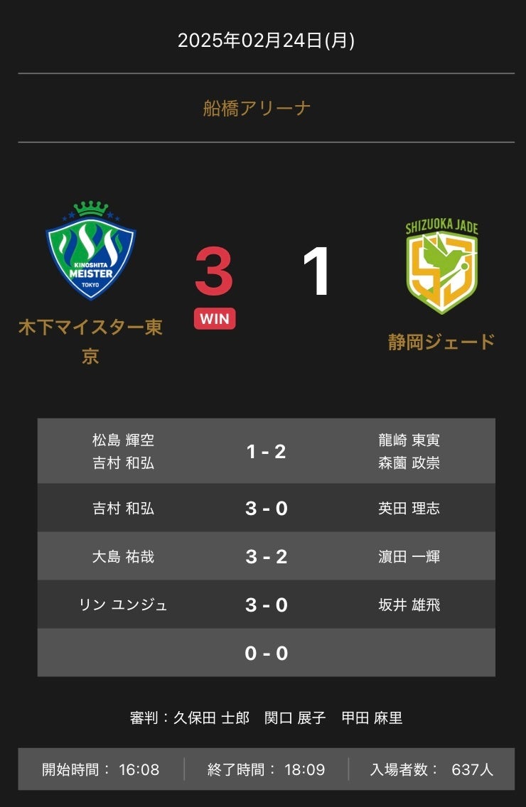 木下マイスター東京と静岡ジェードの試合は、3-1で木下マイスター東京が勝利しました。