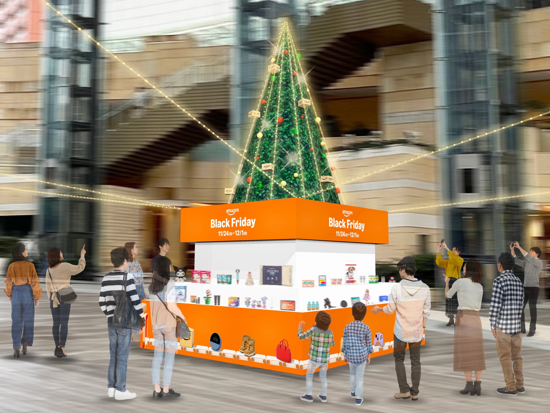 会場の中央には、「Amazon ブラックフライデー」のセール商品やAmazon Boxをモチーフにしたオーナメントで彩られた、高さ6メートルの巨大な「Amazon Black Friday Tree」が登場します。