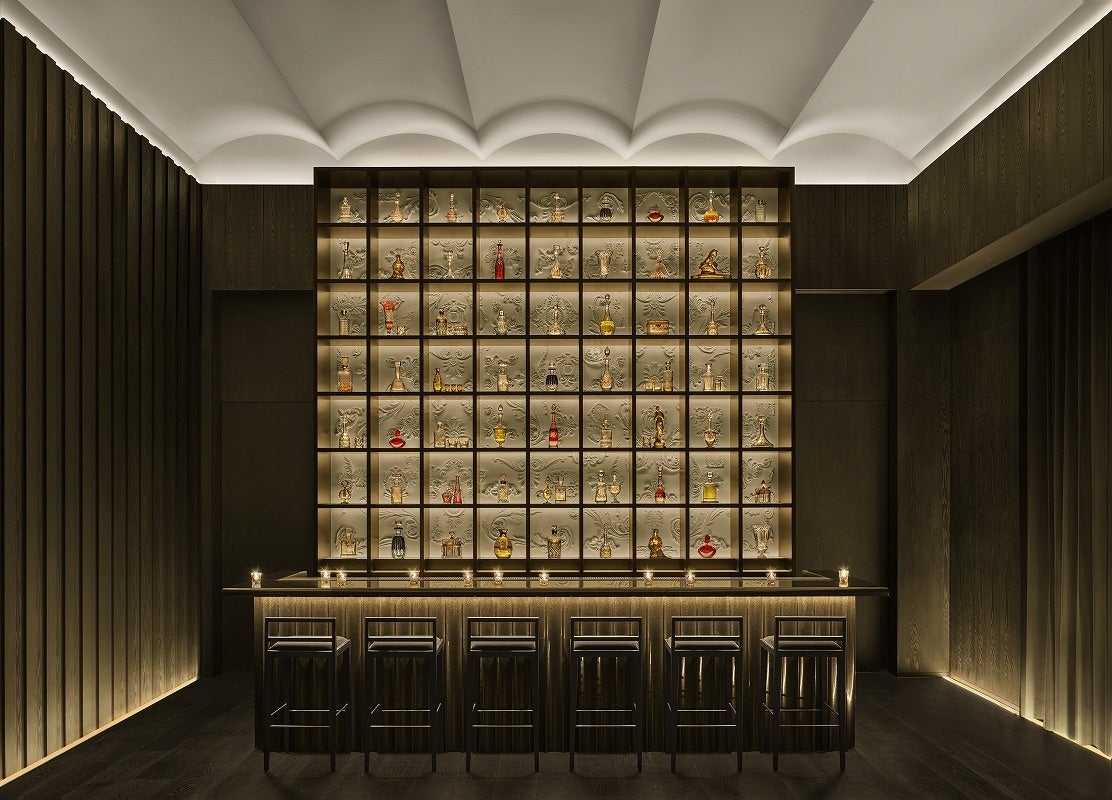 黒を基調に白とゴールドが巧みに配されたこの空間は、ジュエリーの希少素材から着想を得て、また日本の伝統的な工法で、耐久性を増すための「焼杉」からインスパイアされた黒塗りの木材仕上げになっています。ゴールドのアクセント、黒大理石のバーカウンター、高さ5メートルの白いアーチ型バレルヴォルト天井がさらに空間を演出します。親しみやすいバーには、ネロマルキーナ大理石の暖炉が配され、その上にはアーティスト ゲラン・スウィングによる金箔の作品が飾られています。Gold Bar at EDITIONでは、火曜・水曜はGray Vのミックスによるローテンポのクラシック、ジャズ、ソウル、R&B、木曜から土曜の夜にはDJがプレイします。