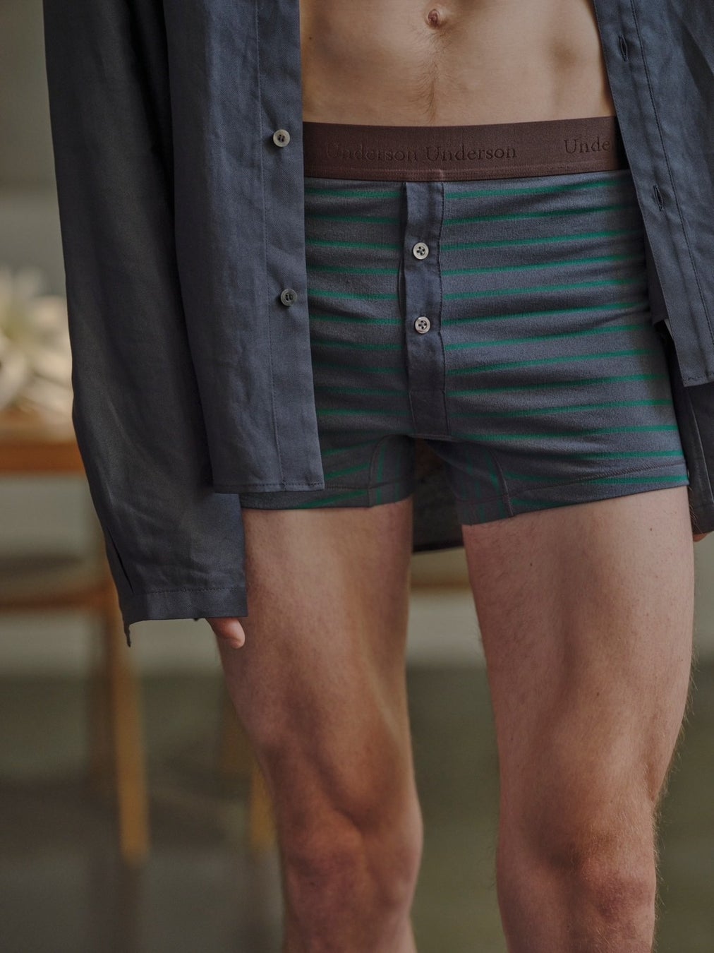 前立ての布帛とボタンがアクセントのショートタイプのボクサートランクス。