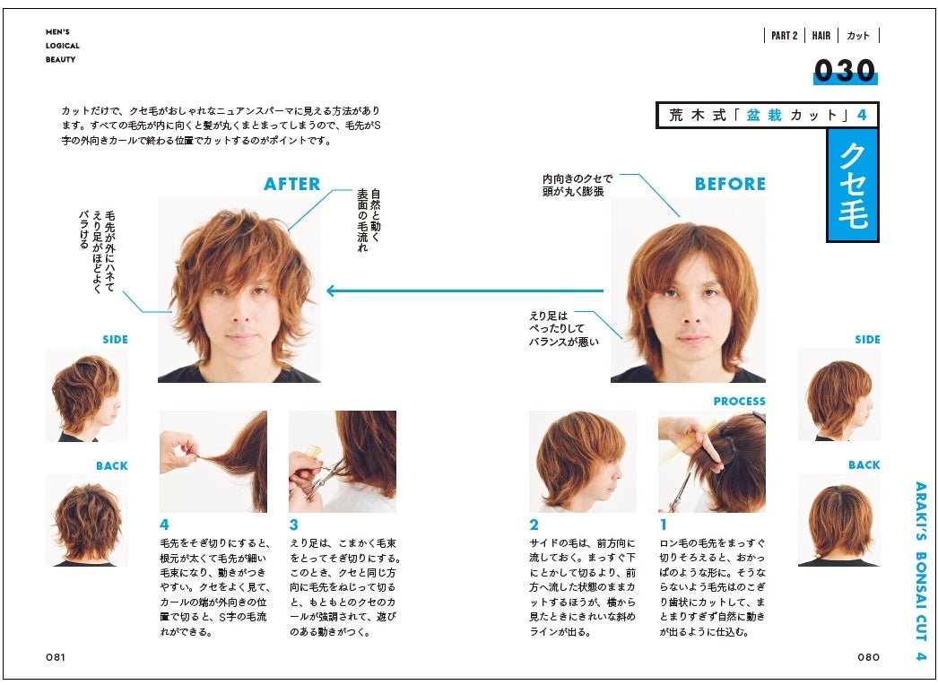男性の印象を大きく左右する髪型。薄毛に悩む男性を救うのが荒木式のヘアスタイリング術。「イケメンの頭部はみな“卵型”です。どこから見ても美しく見えるシルエットが“卵型”だからです。髪型でイケメン度をあげるには、スタイリングで“卵型”をめざせば間違いません。まずご自身の毛流れを鏡でチェックてください。“卵型”を目標に、ボリュームを出すべき部分は毛流れに逆らって毛を立たせるようにスタイリングし、ハチなどボリュームを抑えるべき部分は毛流れに沿ってつぶすようにすればいいのです」。本書では、アーティストたちのどの角度から見てもカッコいい「荒木式盆栽カット」の秘密も公開。