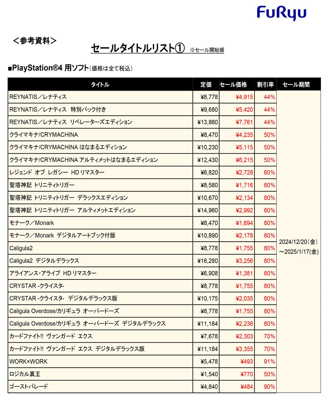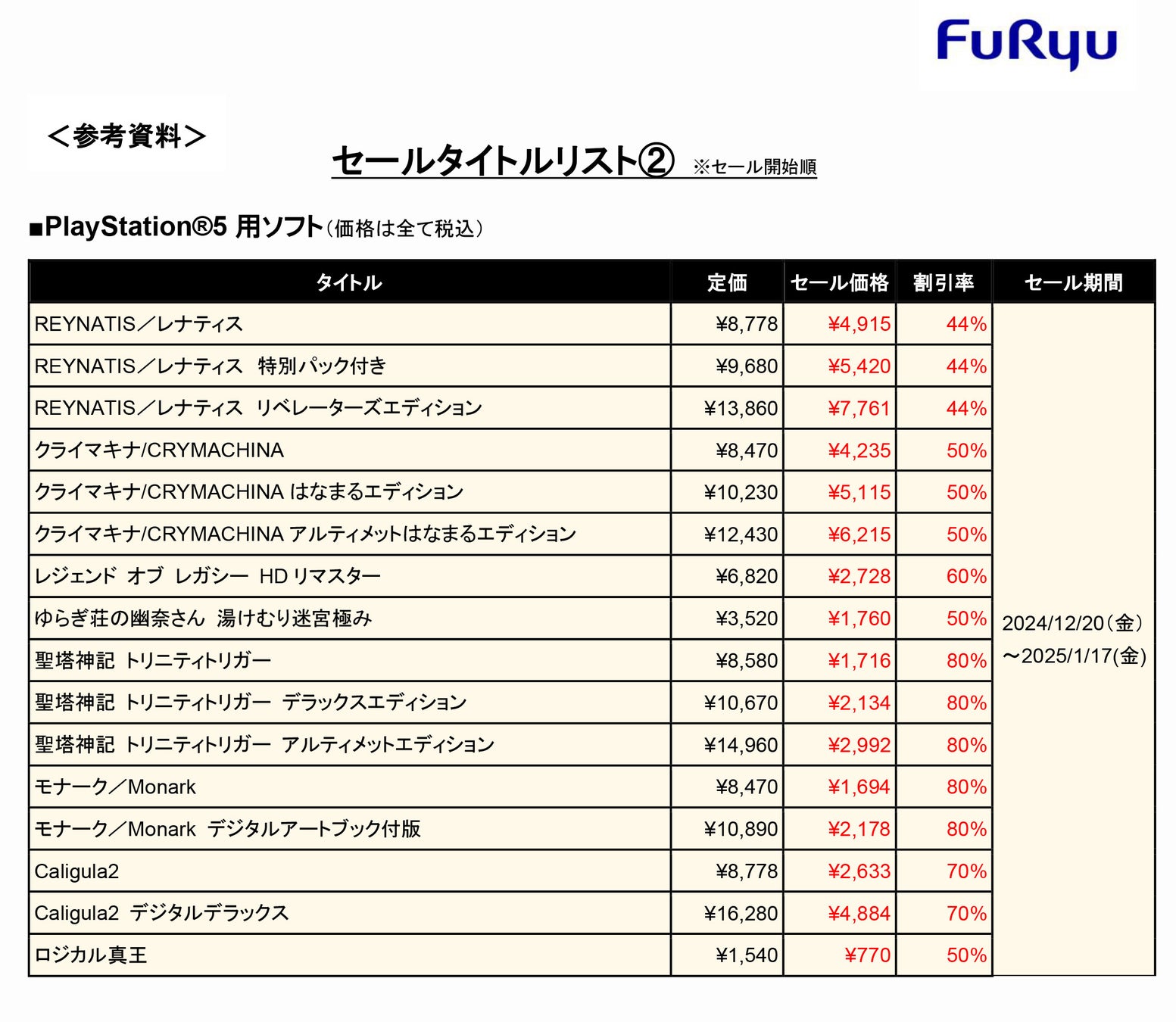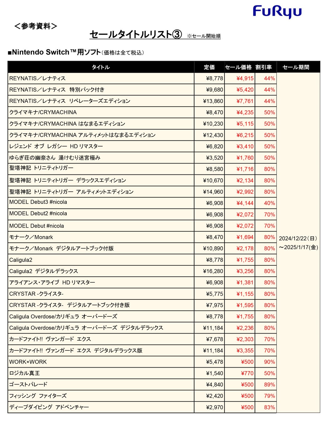 2024年7月25日に発売した最新作『REYNATIS/レナティス』や話題作『クライマキナ/CRYMACHINA』が過去最大割引となる他、『MODEL Debut3 #nicola/モデルデビュー3 ニコラ』、『ゆらぎ荘の幽奈さん 湯けむり迷宮極み』、『聖塔神記 トリニティトリガー』、『モナーク/Monark』、『Caligula2/カリギュラ 2』、など、フリューオリジナルタイトルを含むダウンロードソフト各種がお得な価格にてお買い求めいただけます。