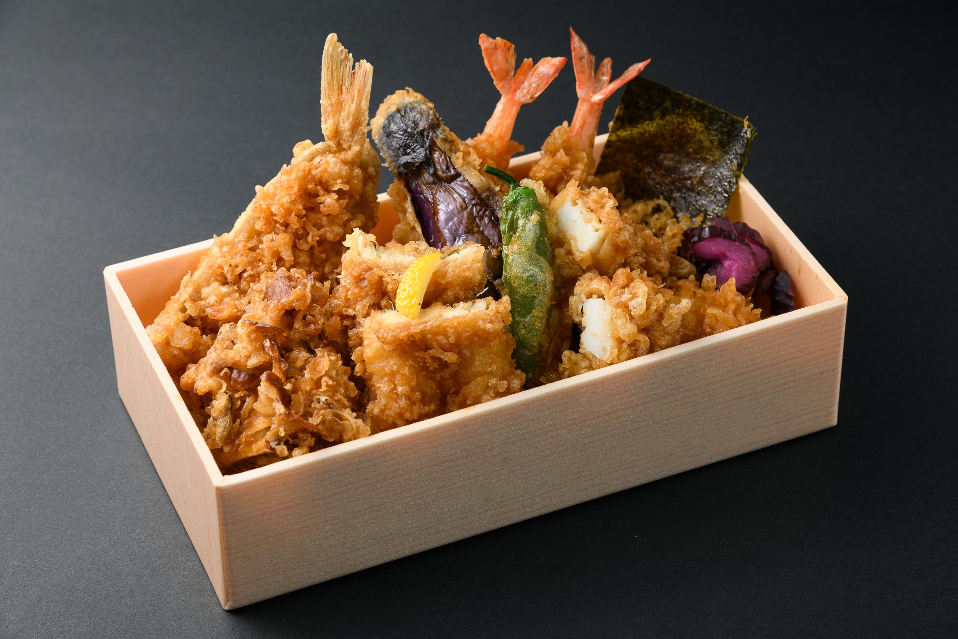 穴子入りをはじめとする金子半之助を代表する3種類の天丼弁当の具材を全部のせた見た目もボリューム満点なお弁当。期間限定・数量限定なのでこの機会にぜひ。
