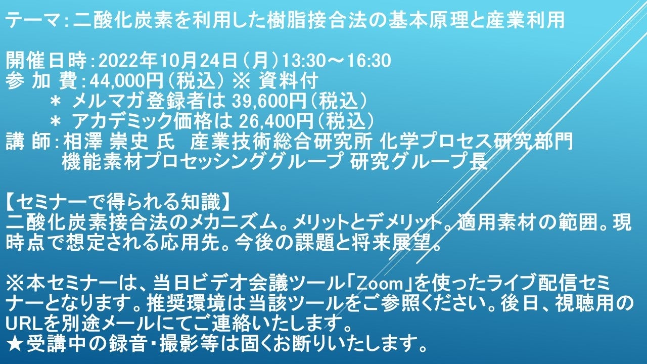 先端技術情報や市場情報を提供している(株)シーエムシー・リサーチ(千代田区神田錦町: https://cmcre.com/ )では、 各種材料・化学品などの市場動向・技術動向のセミナーや書籍発行を行っておりますが、 このたび「二酸化炭素を利用した樹脂接合法の基本原理と産業利用」と題するセミナーを、 講師に相澤 崇史 氏 産業技術総合研究所 化学プロセス研究部門 機能素材プロセッシンググループ 研究グループ長)をお迎えし、2022年10月24日(月)13:30より、 ZOOMを利用したライブ配信で開催いたします。 受講料は、 一般:44,000円(税込)、 弊社メルマガ会員:39,600円(税込)、 アカデミック価格は26,400円(税込)となっております(資料付)。