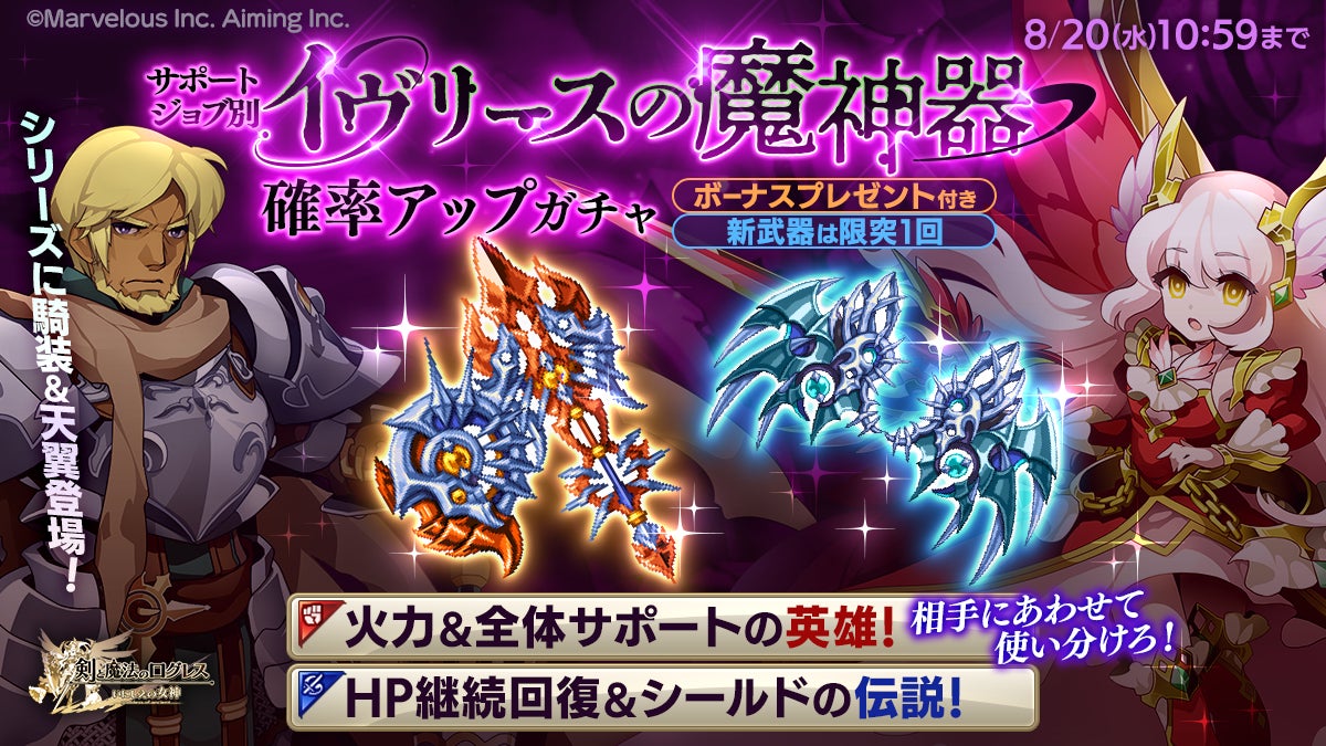 株式会社マーベラス(代表取締役社長:照井 慎一/所在地:東京都品川区)は、スマートフォン向け本格オンラインRPG『剣と魔法のログレス いにしえの女神』において、2025/8/6(水)に新武器がラインナップした「サポートジョブ別 イヴリースの魔神器確率アップガチャ」の販売、および「豪快!がいあジム」の開催などを含むアップデートを行ったことをお知らせいたします。