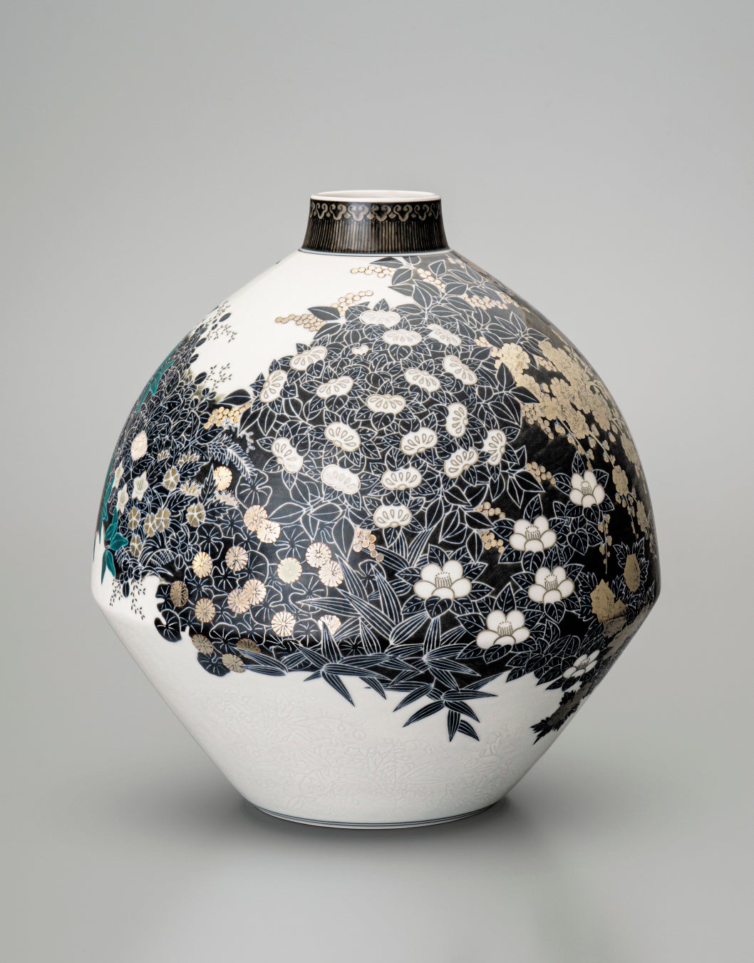 十四代今泉今右衛門先生は「色鍋島」の技法「墨はじき」をさらに発展させ、白の微妙な世界を表現した「雪花墨はじき」や白金色を輝かせる上絵「プラチナ彩」を生み出し、平成26年に陶芸部門において史上最年少で国の重要無形文化財保持者(人間国宝)に認定されました。本展は、その認定から初の秋田での個展となり、秋田開催を記念した特別な意匠作品「色絵雪花薄墨墨はじき秋田模様花瓶」をはじめ、数々の作品を一堂に集めます。