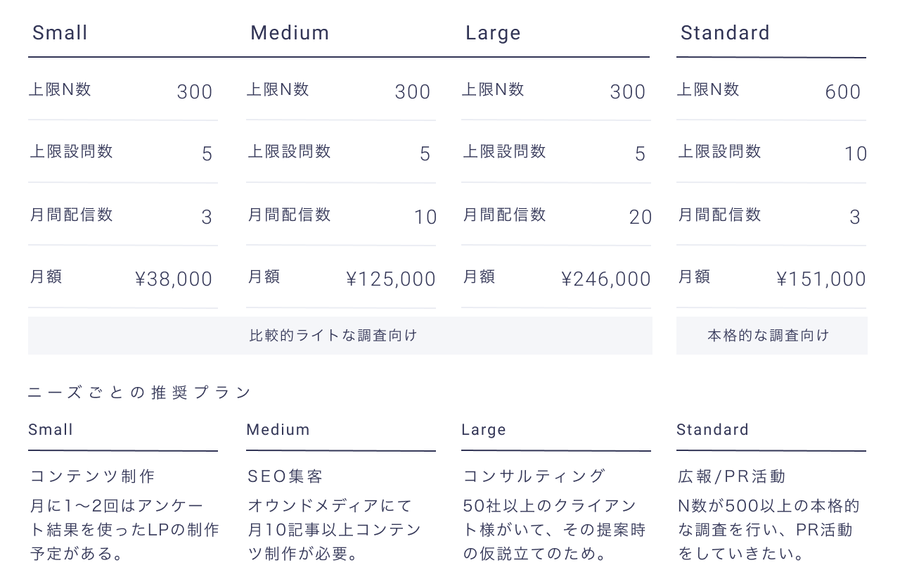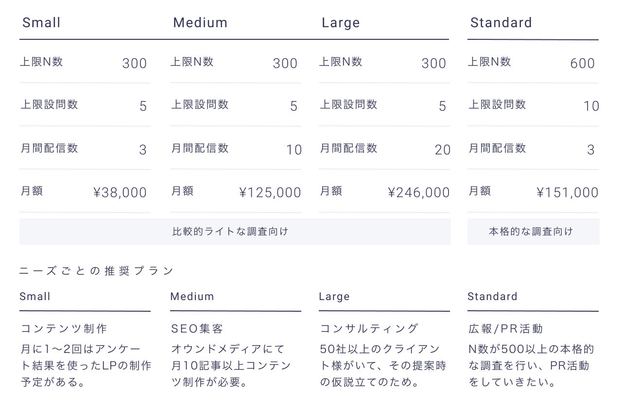 月額38,000円からアンケート調査可能で、定額制かつ低価格でご利用いただけます。また、Largeプランでは月間アンケート調査回数上限が20回です。アンケート作成から調査完了までを最短1日で可能、完全セルフ型の管理画面で手軽かつ簡単に作成・収集・結果分析ができます。