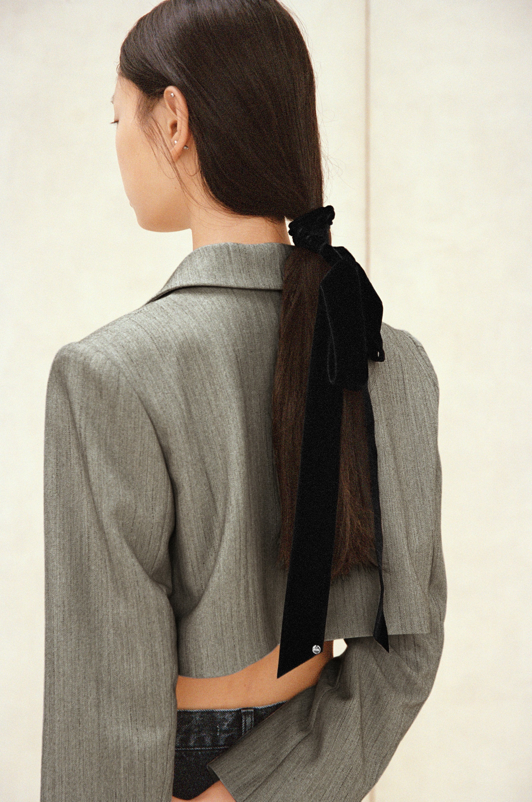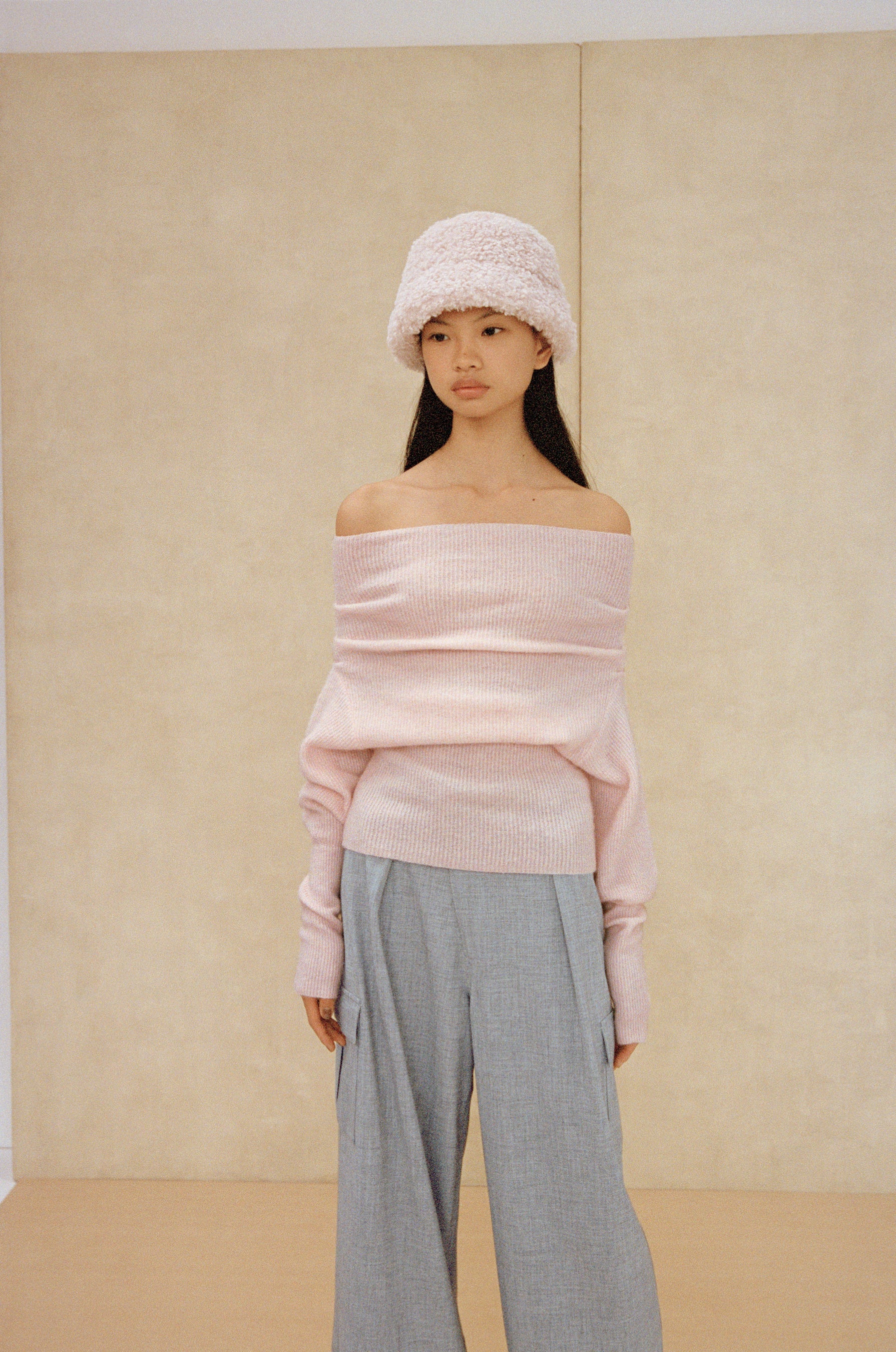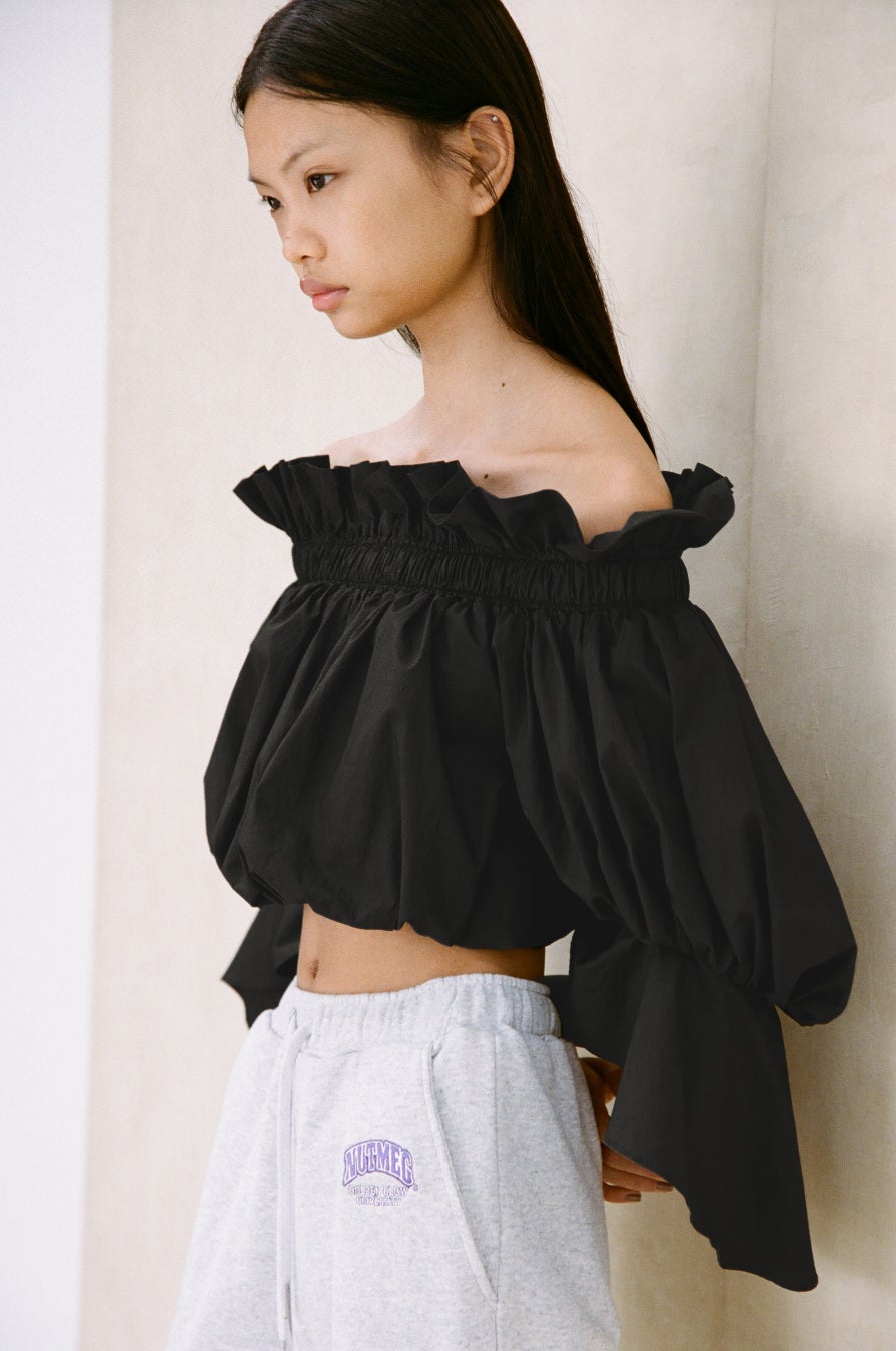 直線的なオフショルダーやタイに、柔らかなドレープ、クロップド丈のバランスなど、